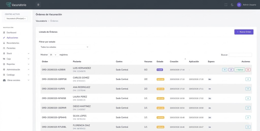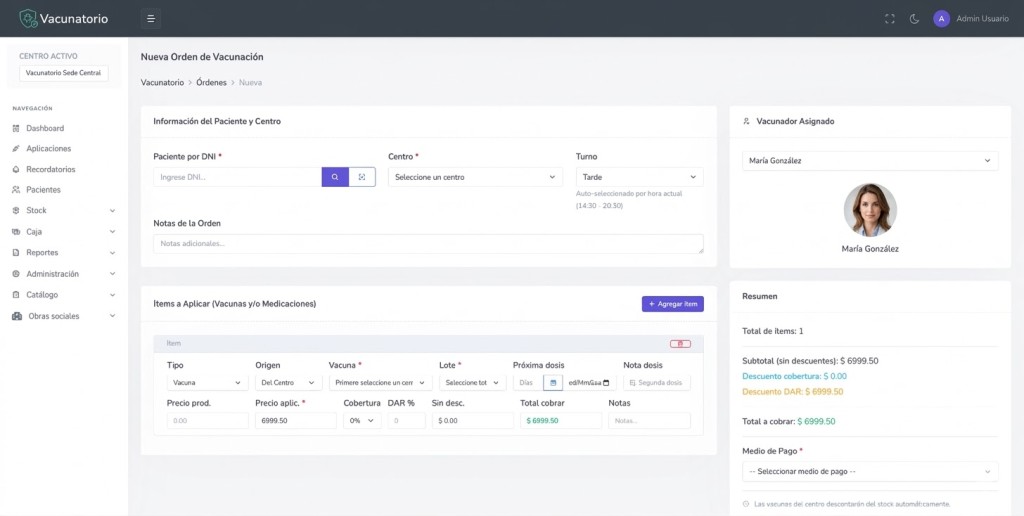 El corazón de Zucovac está en las órdenes de vacunación, que permiten seguir cada atención con un flujo claro: orden creada, vacuna aplicada y orden finalizada. En ese recorrido, el sistema registra paciente, obra social, vacuna, lote, vacunador, próxima dosis, movimiento de caja y estado final, todo de forma auditable. También permite buscar pacientes por DNI, usar escáner de código de barras y mantener el historial completo de vacunación a mano.