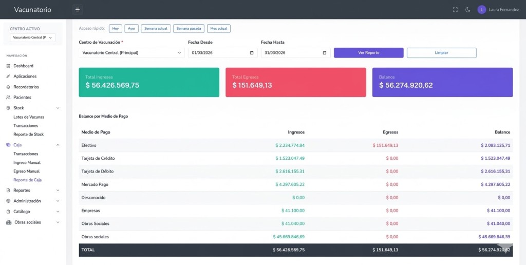 Uno de los mayores diferenciales de Zucovac es que no se queda solo en el acto clínico: también resuelve la parte administrativa. El sistema gestiona inventario con lotes y vencimientos, alerta sobre vacunas próximas a vencer, reserva stock al crear una orden y descuenta automáticamente al aplicar. A eso le suma gestión de caja, múltiples medios de pago, coberturas de obras sociales aplicadas automáticamente y reportes exportables, incluyendo integración con catálogos y reportes sanitarios como SISA.